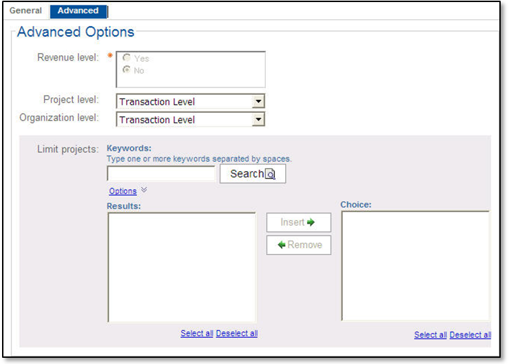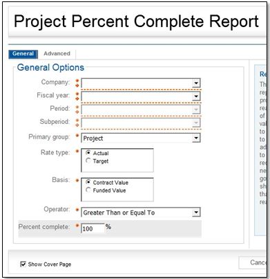 Reorganization, Alternate Project, and Project Manager are optional prompts that require some prior setup in Costpoint before you can use them. To use Reorganization, first establish Reorganization structure in . To use Alternate Project, first establish alternate project structure in . To use Project Managers, link project managers to projects on the Manage Project User Flow screen in Costpoint. |