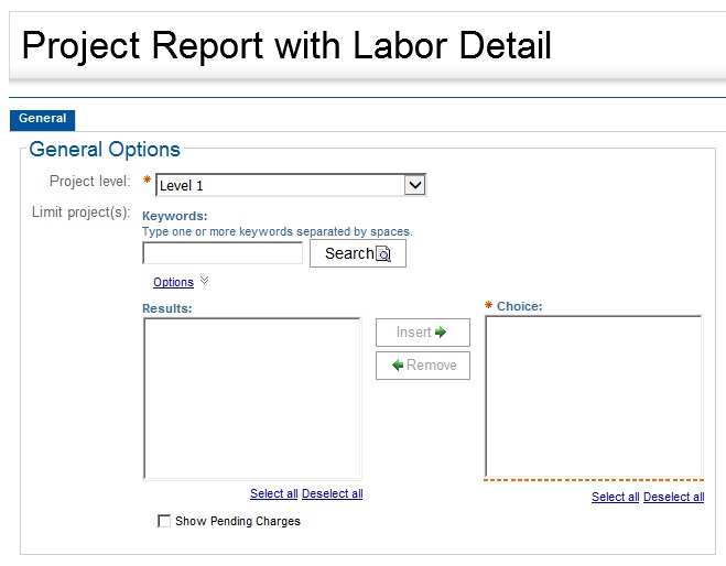 Use this option to limit the report to selected projects. (If you make no selections, the report includes all projects.) In Keywords, enter one or more characters for which you want to search to retrieve projects. The list displays values as a combination of ID and name, so you can search by ID or by name. To enter more than one search string, separate them with spaces. Click Options to specify how you want the search to match your entries with the IDs or names. (If you search by name, use one of the Contains... options, rather than the Starts with... options.) Click Search to list the matching projects in Results. Select the projects in Results that you want to include and click Insert to move them to Choices. To select multiple projects that are together in the list, click the first project in the group and then press SHIFT as you click the last one in the group. To select multiple projects that are not listed together, press CTRL as you click each one. When you generate the report, it includes only records for the projects in Choices. |