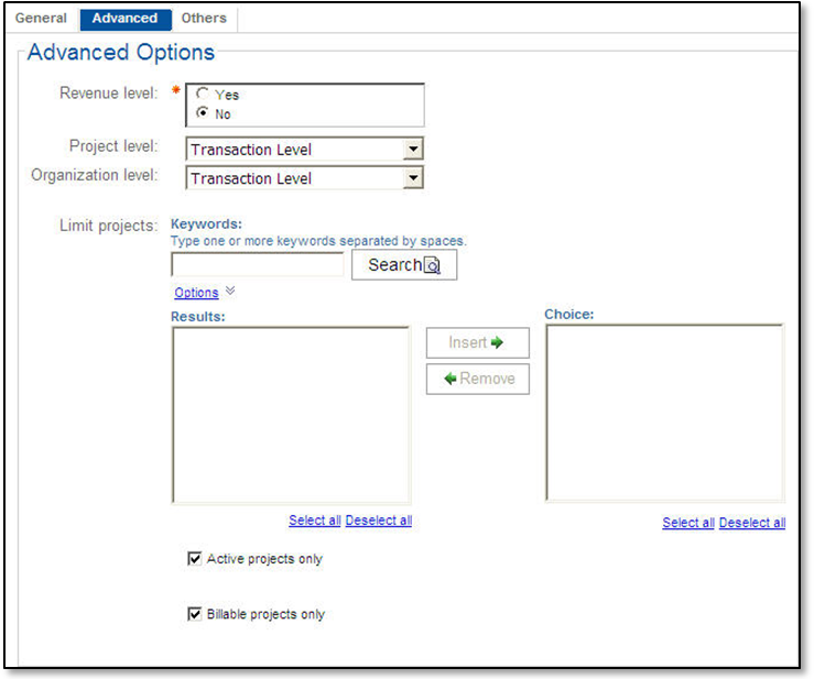 Select Yes to display project data at revenue level. Select No and then select a project level in the next field to display data at project level.