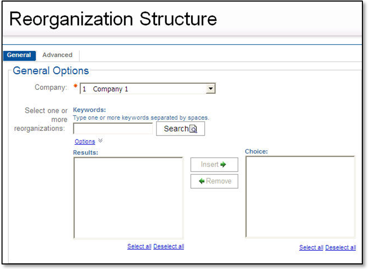 Enter a portion of one or more reorganization IDs in the Keywords field and click Search to list reorganizations to include on the report. You can use the steps in entering keywords in the Keywords search fields to return the results you are looking for. |