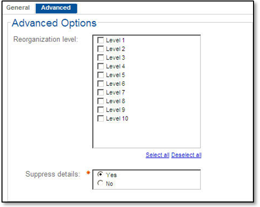 Select the level of reorganization at which you want the report printed. All lower levels will be rolled up for the report. |