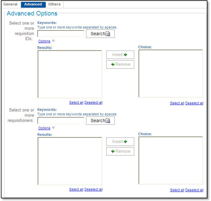 Enter a portion of one or more requisition IDs in the Keywords field to list requisitions to include on the report. You can use the steps in entering keywords in the Keywords search fields to return the results you are looking for. |