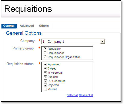 Select one or more requisition statuses to use as a filter to include on the report. Options are: