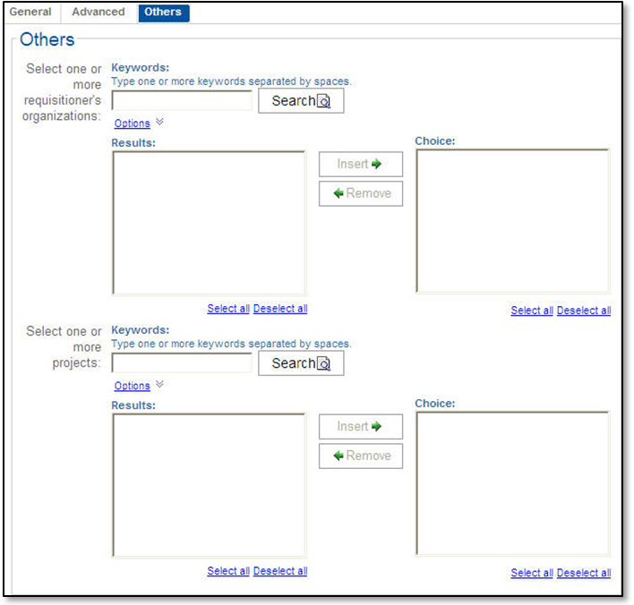 Enter a portion of one or more organization IDs in the Keywords field to list requisitioner’s organizations to include on the report. You can use the steps in entering keywords in the Keywords search fields to return the results you are looking for. |