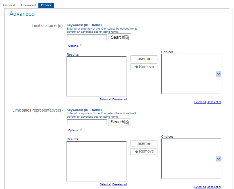Enter a portion or the entire ID of one or more sales representatives in the Keywords: (ID + Name) field to be added on the report. You can use the steps in entering keywords in the Keywords fields to return the results you are looking for. |