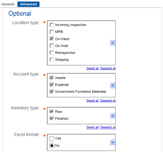 Select the account type(s) of the inventory records you want to include on the report. The account types are the following: