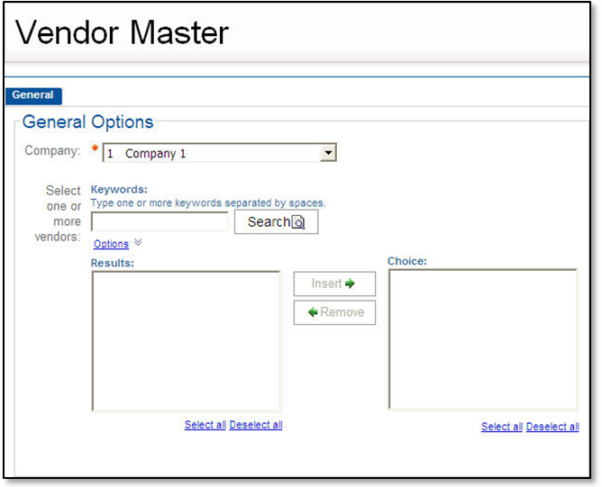 Enter a portion of one or more vendor IDs in the Keywords field and click Search to list IDs to include on the report. You can use the steps in entering keywords in the Keywords search fields to return the results you are looking for. |