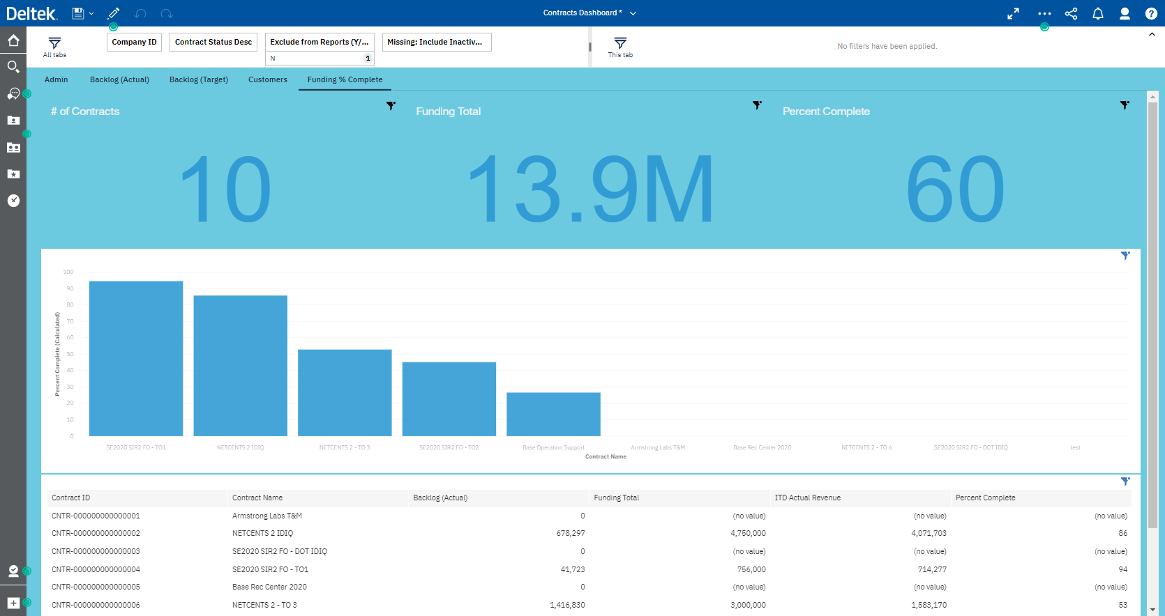 - Funding % Complete: Displays the percentage of completion of contracts based off a specified percentage amount.