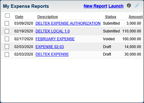 - Launch: This link displays only if you have not selected any check box corresponding to the expense reports. Click this link to open the Expense Report screen.