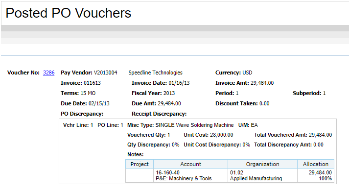 In the Posted PO Vouchers drill thru, click a voucher number to view the voucher details.