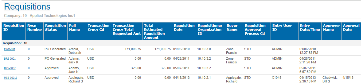 In the Requisition Detail - Drill Thru report, click a P/O Number to view purchase order details.