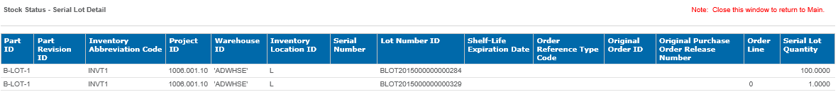 Click the Warehouse or Inventory Location ID values to drill thru the Stock Status - Serial Lot Detail.