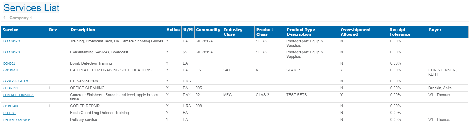 The following is a sample Services List report.