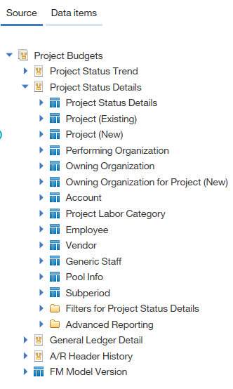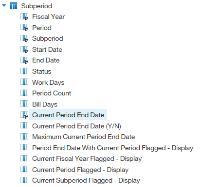 The other query subjects provide additional data related to the data in the fact table that you may want to use or display in your reports. Of special note is the Subperiod query subject. It not only lists accounting period information but also provides a yes/no flag that identifies the current open period.