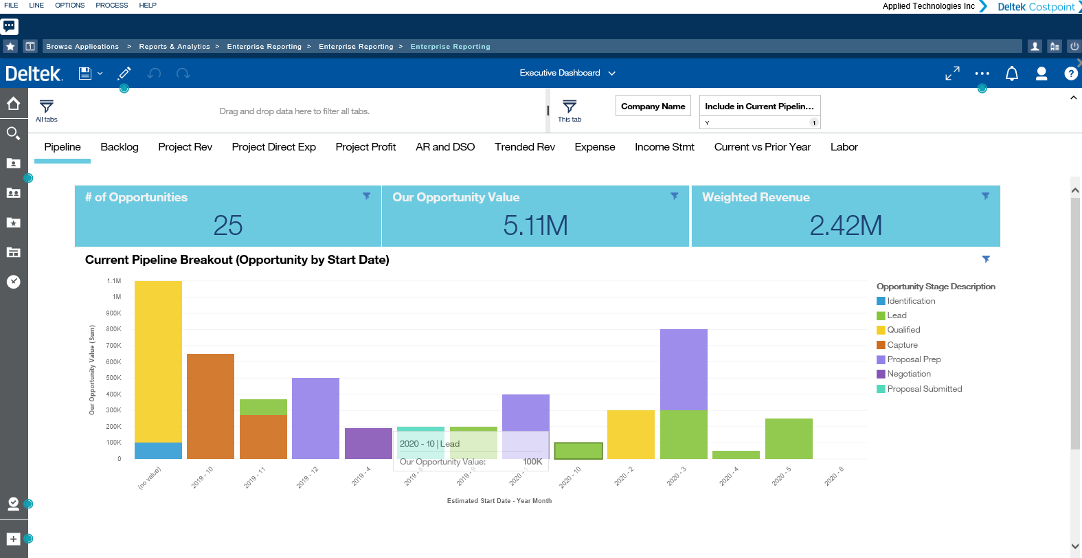 • Pipeline and Backlog: This area shows information about the number of opportunities and their corresponding values as well as funding and contract backlogs.