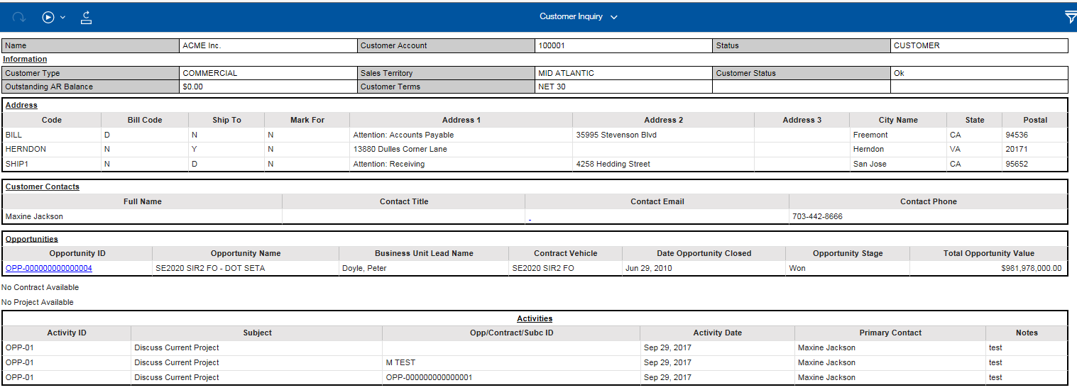Sample Report This is a sample Customer Inquiry report. Parent Topic: Customer Inquiry HomeReports & AnalyticsWelcome to Costpoint Business IntelligenceCRM & ContractsCRM & Contracts ReportsCustomer InquirySample Report
