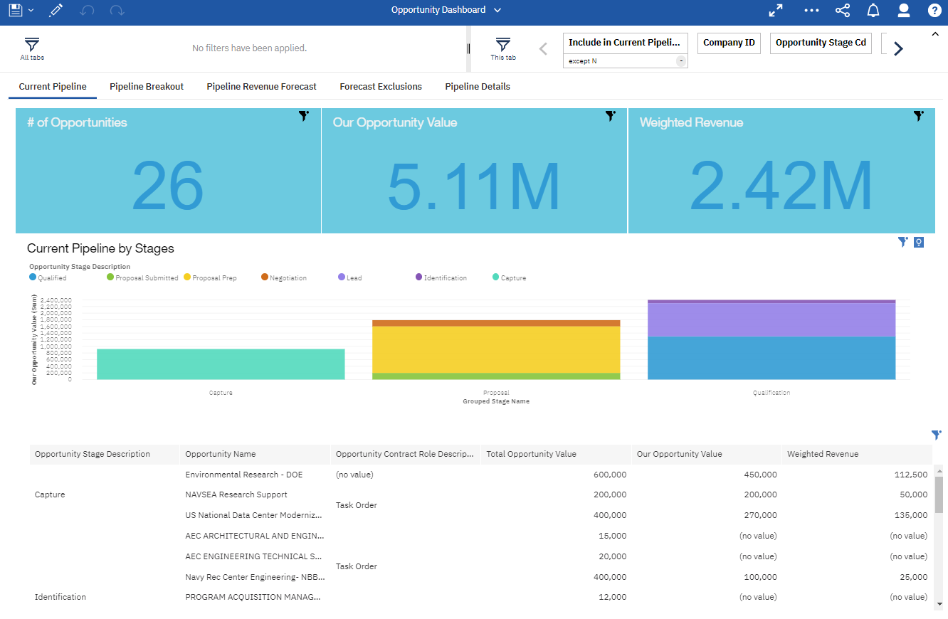 - Pipeline Breakout: This tab displays the summary of opportunity pipeline amounts broken out by stage based on the anticipated award date. This lets you assess future revenue for the company.