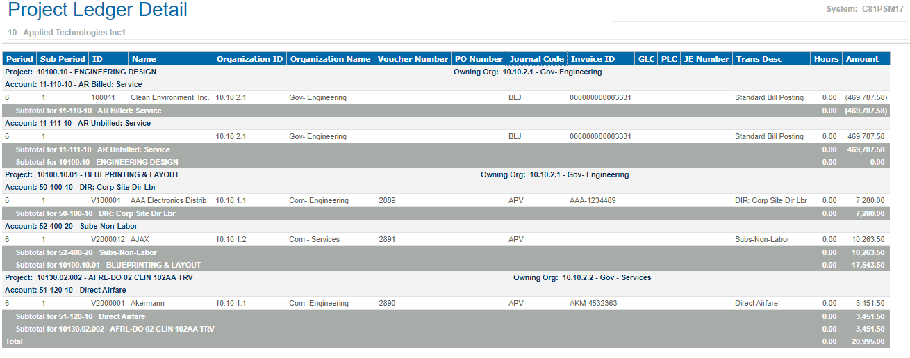 Sample Report This is a sample of the Project Ledger Detail report. Parent Topic: Project Ledger Detail Report HomeReports & AnalyticsWelcome to Costpoint Business IntelligenceProjectsProject ReportsProject Ledger Detail ReportSample Report