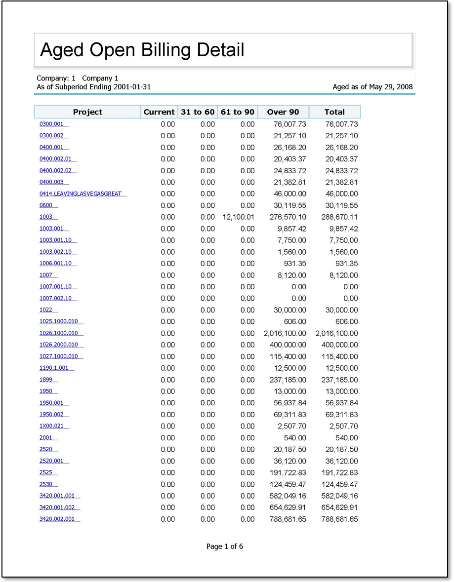 Sample Report Sample Aged Open Billing Detail report. Parent Topic: Aged Open Billing Detail Report HomeReports & AnalyticsWelcome to Costpoint Business IntelligenceLegacy ReportsCostpoint Enterprise ReportingBilling ReportsAged Open Billing Detail ReportSample Report