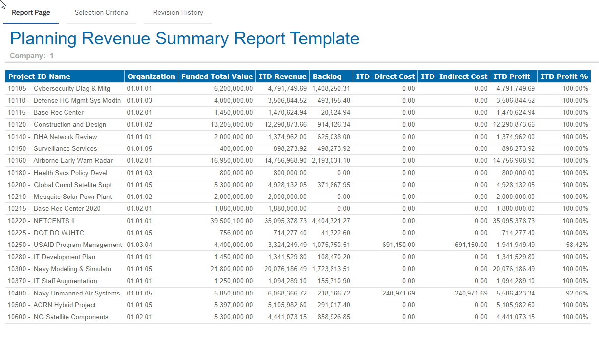 Sample Report This is a sample Planning Revenue Summary Report Template. Parent Topic: Planning Revenue Summary Report Template HomeReports & AnalyticsWelcome to Costpoint Business IntelligencePlanningPlanning ReportsPlanning Revenue Summary Report TemplateSample Report