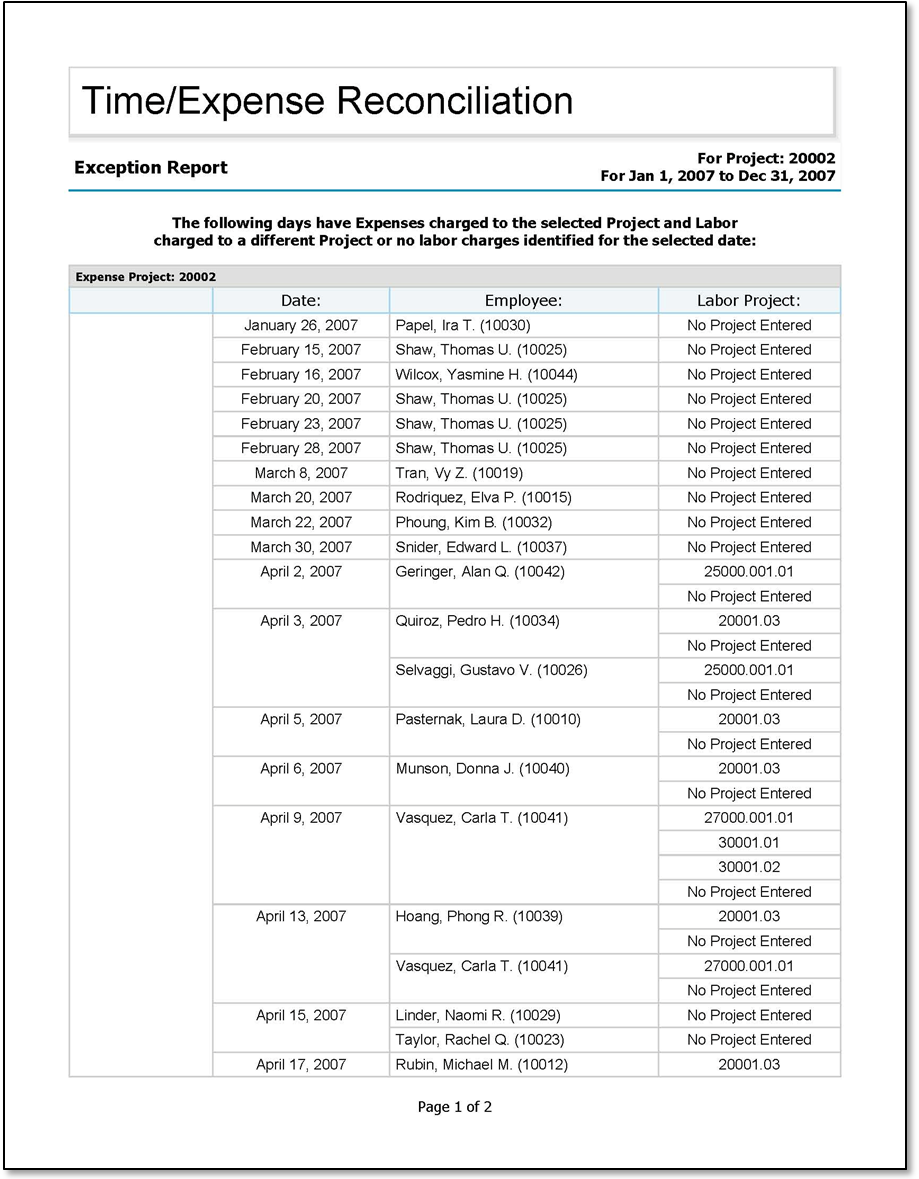 Sample Report Sample Time/Expense Reconciliation report. Parent Topic: Time and Expense Reconciliation Report HomeReports & AnalyticsWelcome to Costpoint Business IntelligenceLegacy ReportsCostpoint Enterprise ReportingTime and Expense ReportsTime and Expense Reconciliation ReportSample Report