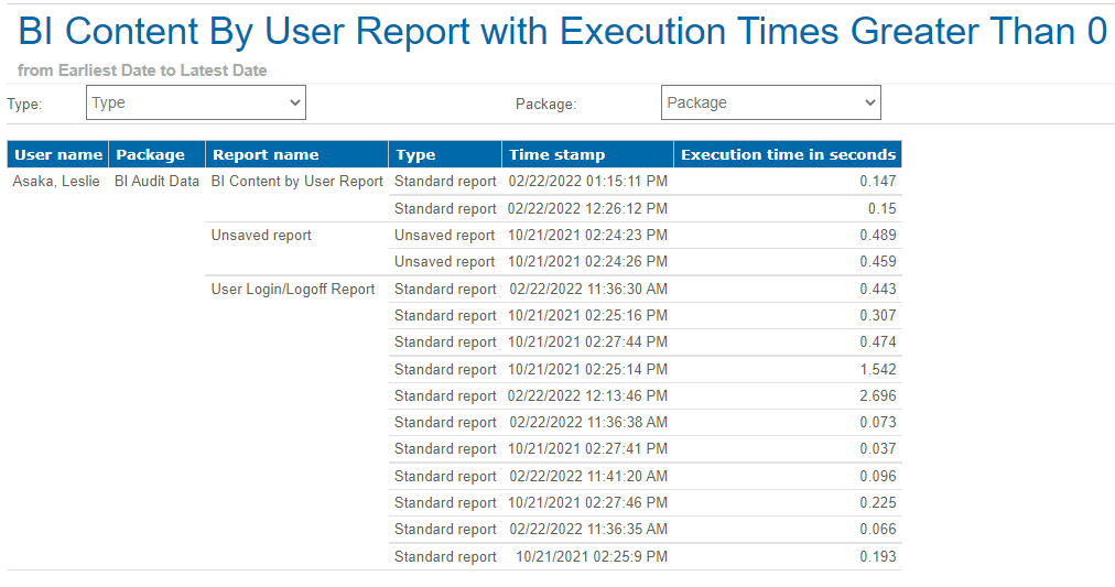 Sample Report You can filter the BI Content by User report by package and type. Parent Topic: BI Content by User Report HomeReports & AnalyticsWelcome to Costpoint Business IntelligenceBI Audit Reports (for Cloud users only)BI Content by User ReportSample Report