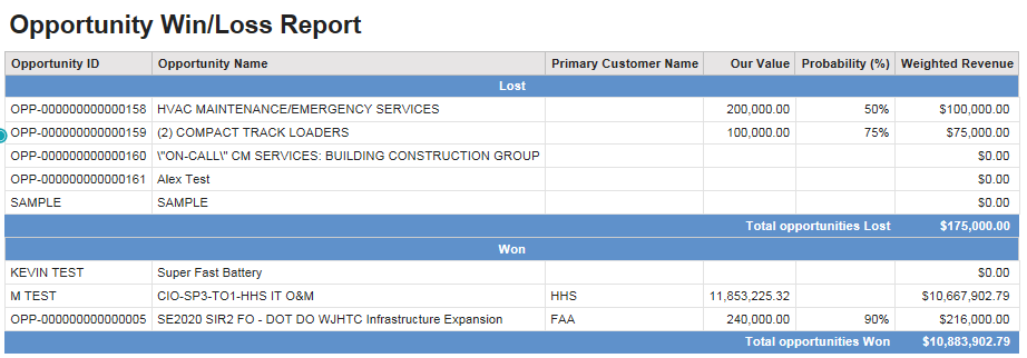 Sample Report This is a sample Opportunity Win/Loss report. Parent Topic: Opportunity Win/Loss Report HomeReports & AnalyticsWelcome to Costpoint Business IntelligenceCRM & ContractsCRM & Contracts ReportsOpportunity Win/Loss ReportSample Report
