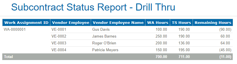 The drill thru report shows the planned, actual, and remaining hours of each vendor employee assigned to the work assignment, based on the charges from their timesheets. If the TS Hours (actual hours) is greater than the WA Hours (planned), the Remaining Hours will display in parenthesis, indicating that the vendor employee worked more hours than planned for the work assignment.