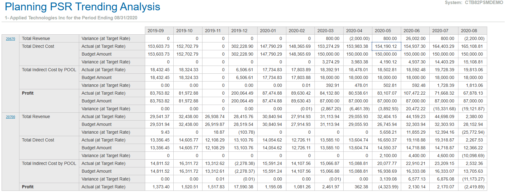 Sample Report This is an example of the Planning PSR Trending Report. Parent Topic: Planning PSR Trending Analysis HomeReports & AnalyticsWelcome to Costpoint Business IntelligenceOverviewPlanningPlanning ReportsPlanning PSR Trending AnalysisSample Report