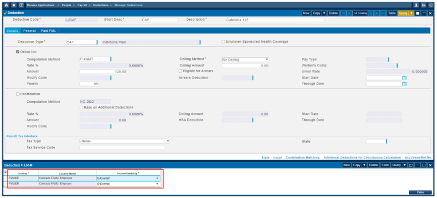 Local Tax codes representing the employee and employer-paid Colorado FAMLI tax in the Local subtask of the Manage Deductions screen and the