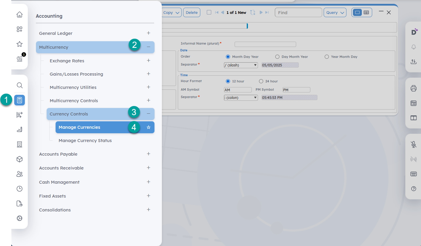 4. Select an application. Applications are the lowest level of the hierarchy. Select an application to open it. In this example, the Manage Currencies application is selected. You can select the star next to the application name to add it to the customizable My Menu for quick access.