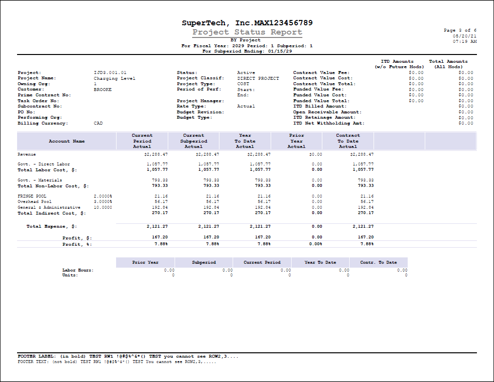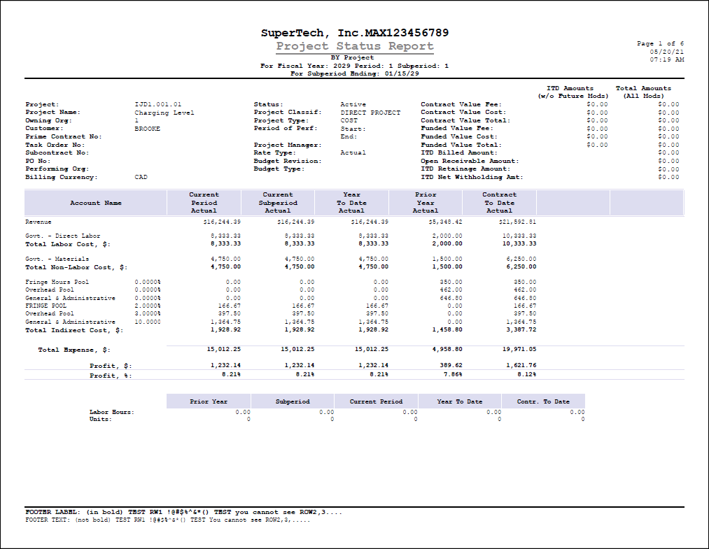 Here is an example of the Project Status Report with amounts printed in the functional currency. Functional Currency is selected in Column Options in Print Project Status Report.