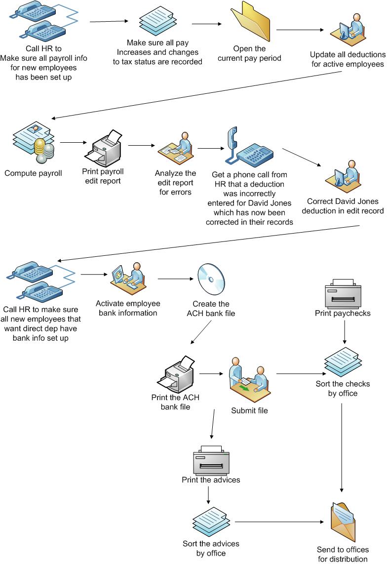 Payroll Process Flow The Payroll Process Flow diagram describes the overall activities involved in Payroll. Parent Topic: Payroll HomePeoplePayrollPayroll Process Flow