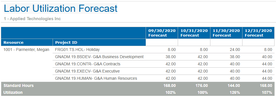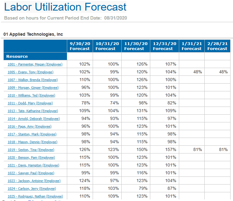 The following image is a sample of the Labor Utilization Forecast report.