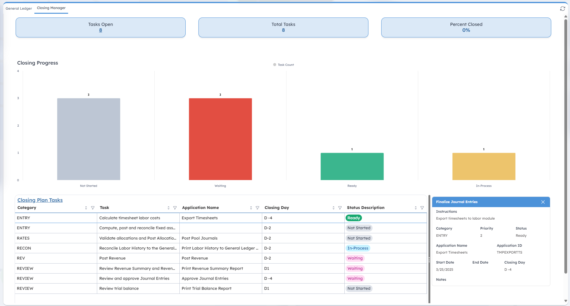 This bar chart helps you assess your progress in completing closing tasks for the current period. Tasks are categorized as: