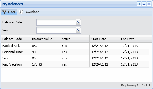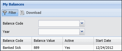 My Leave Balances displays an employee's leave balances, such as Sick and Vacation. The Leave Type Value displays the balances as of the current day. Leave balances can also be viewed on the Leave Balances form.