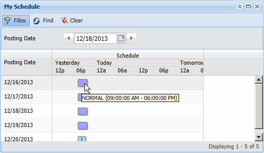 My Schedule displays the employee's schedule for the current calendar week. The columns are Posting Date and Schedule. Any hours where the employee is scheduled to work will be highlighted by a color. To view the schedule's start and end time hover over the highlighted area.