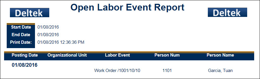 The Open Labor Event Report displays information about open Projects or Work Orders for a given period of time.