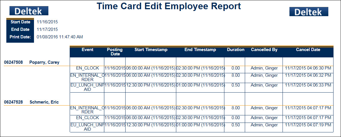 Cancelled By: Identifies the person who modified the Event on the timecard.