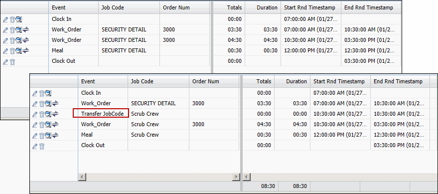 For example, a supervisor asks an employee to perform cleanup tasks for the remainder of a work day. The Job Code for these tasks is Scrub Crew and it has a Pay Rate of 25.00/hour. The employee performs these tasks as instructed. The next day, to make sure the employee is paid correctly, the supervisor will use Add Punch Pair to post the TRANSFER_JOB_CODE_IMMEDIATE event to the employee’s timecard and select the Scrub Crew Job Code. The timecard illustration below shows how the employee’s Job Code changed from Security Detail to Scrub Crew.