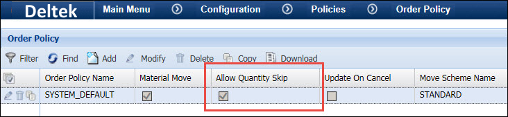 To configure this feature, you must check the Allow Quantity Skip box in your Order Policy.
