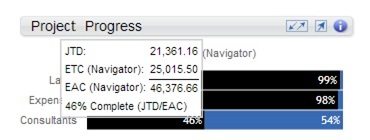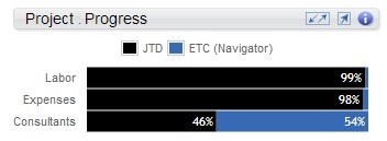 Use the Project Progress dashpart to view the overall percent complete for the project's assigned labor, expenses, and consultants, which allows you to quickly assess where you stand on the project through the current date.