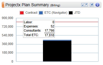 The following example shows the Project Plan Summary chart at Billing. As indicated on the legend, when viewing billing amounts the JTD, ETC (Navigator), and Contract are color coded so that you can easily compare their amounts at a glance. The JTD and ETC (Navigator) are shown together on a bar, which allows you to summarize how they are trending simply by the colors that represent the amounts. In addition, the contract displays as a separate horizontal line across the chart, which provides a contrasting visual so you can quickly see how close the JTD and ETC are to the contract. It can even show these amounts as higher than the contract, which indicates a project that is currently over budget and requires review.