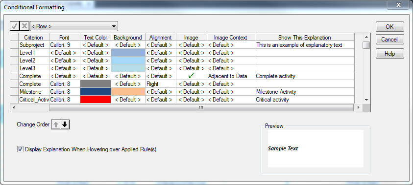 You can enter the explanatory text captions in either the Bar Set Preferences or Conditional Formatting dialog box, under the Show This Explanation column.