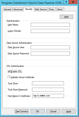7. Test the connection by clicking Test Connect, entering the username and password provided to you in your service request ticket, and clicking OK.