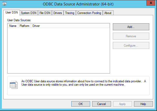 Be sure to open the correct architecture version of ODBC Data Source Administration (XX-bit) based on the architecture version of the driver that was installed; either 32-bit or 64-bit