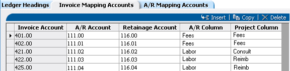 AR Column of the Invoice Mapping Accounts tab are user-defined on the Ledger Headings tab of Accounts Receivable Configuration and may be different for your company.