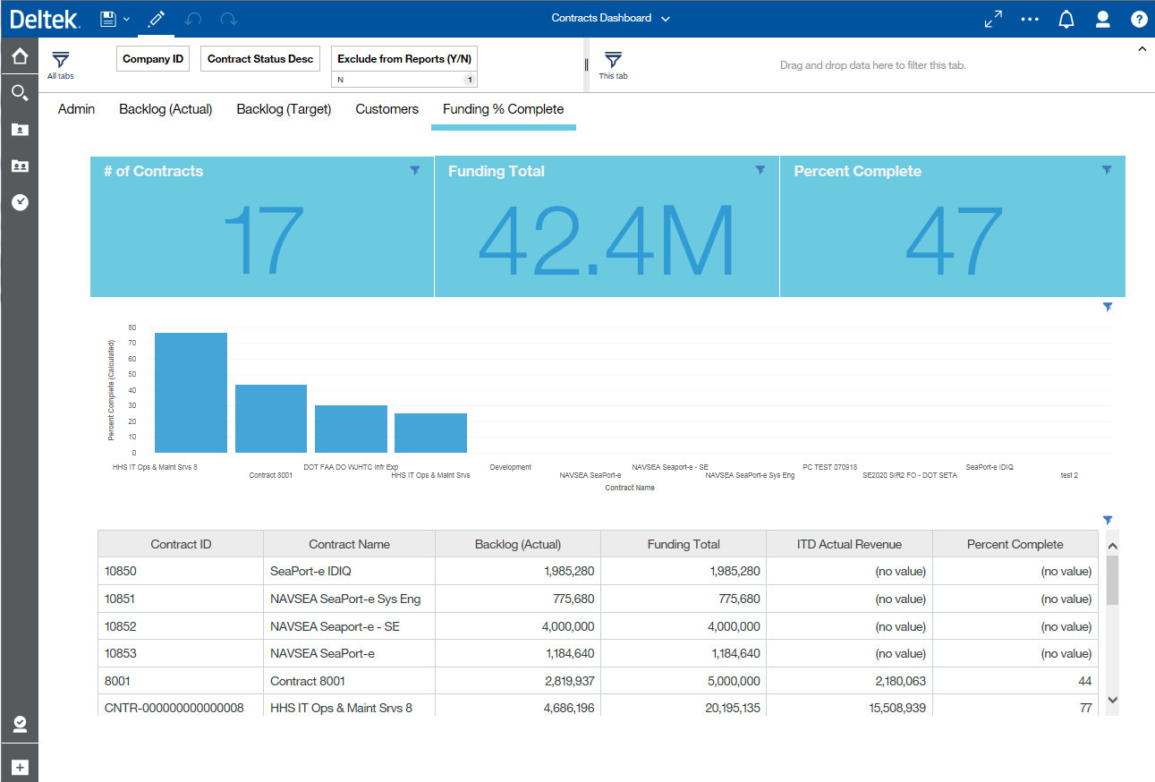 Use the Contracts Dashboard to see the percentage completion of contracts. It helps you identify fund limitation issues ahead of time if there are any.