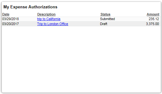 By default, the dashpart displays 10 of your most recent expense authorizations in descending order by Date.