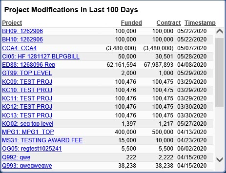 The Project Modifications dashpart is a numerical table that displays the total funded and contract values of top-level projects that had modification updates and/or additions (at any project level) in the past "x" days, together with the timestamp of the most recent modification. You can set the number of days on the Parameters tab. The data on this dashpart comes from Costpoint.